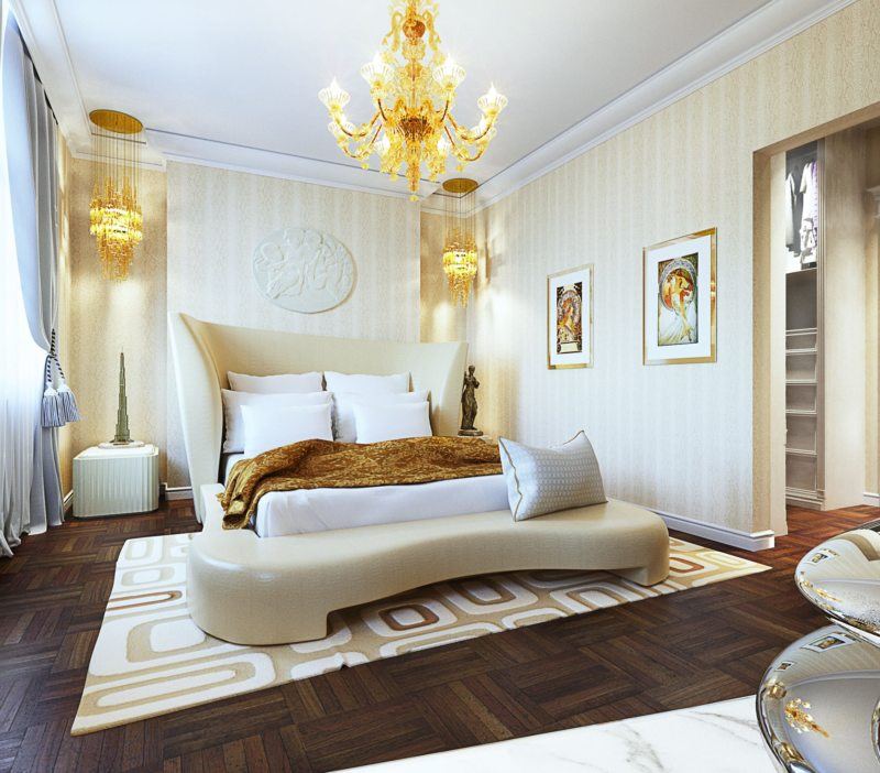 В качестве мебели в спальне красиво смотрятся большая массивная кровать, комод, классический гардероб и прикроватные тумбочки со старинными будильниками. Интересным украшением станет балдахин с тяжелой, покрытой затейливыми узорами тканью.