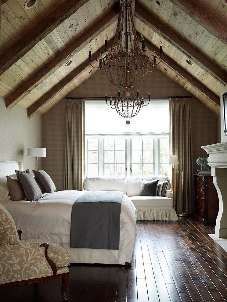 Светлые тона в отделке стен и текстиле спальни, выступают отличным контрастом темным шторам, кованой люстре и внушительному деревянному потолку.